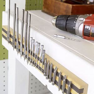 - Look at these ideas to organize your garage. I really like this magnetic drill bit holder.